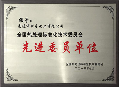 2013年7月, 全國熱處理行業授予南通科星化工有限公司全國熱處理標準化技術委員先進委員單位。