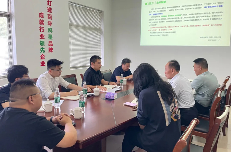 2025年9月11日下午,南通市發(fā)改委經(jīng)濟運行調(diào)節(jié)處處長王帥軍,四級主任科員俞榮、姬一峰,海安市發(fā)改委黨組副書記、副主任楊成龍,白甸鎮(zhèn)副鎮(zhèn)長郭勇及經(jīng)發(fā)辦相關負責人蒞臨南通科星化工股份有限公司開展走訪調(diào)研工作。此次調(diào)研旨在深入了解企業(yè)發(fā)展現(xiàn)狀,傾聽企業(yè)需求,為企業(yè)排憂解難,助力企業(yè)高質(zhì)量發(fā)展。科星董事長吳龍鐵及副總經(jīng)理劉小燕在工廠行政樓會議室熱情接待了來訪領導,并進行了深入交流。