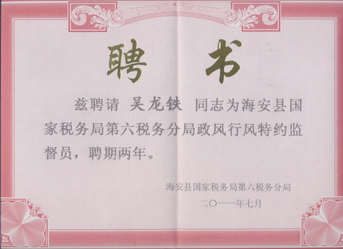 公司總經理被聘為海安縣國家稅務局第六分局政風行風特約監督員。