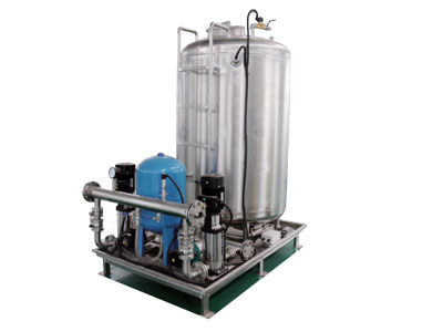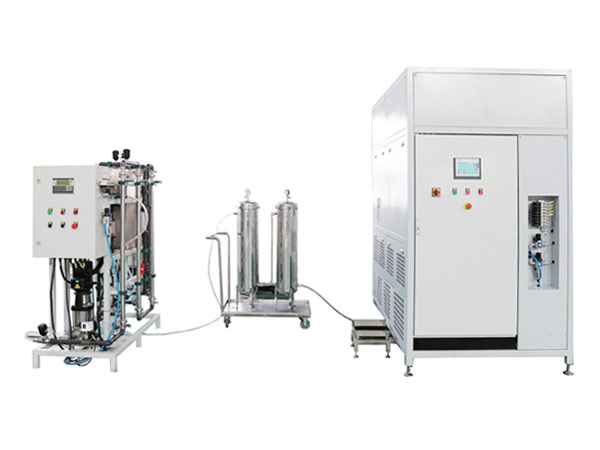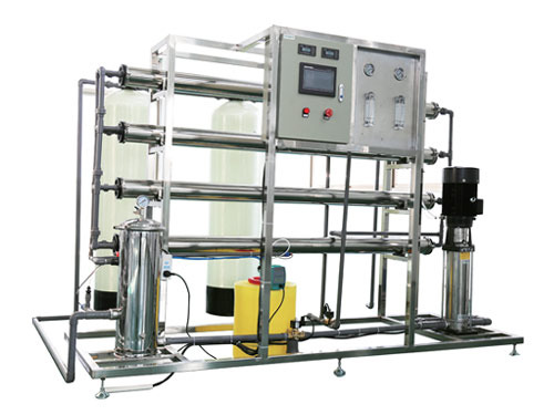 該設備在預處理階段采用多介質過濾器、活性炭過濾器、鈉離子軟化床去除泥沙、余氯、懸浮物、部分重金屬離子,通過精密過濾器攔截水體中膠體、小顆粒,經過反滲透膜(RO膜)去除水體中絕大部分離子,脫鹽率可以達到98.5%以上,二級反滲透膜再次脫鹽,超純水電導率可以達到在5μS/cm以下。