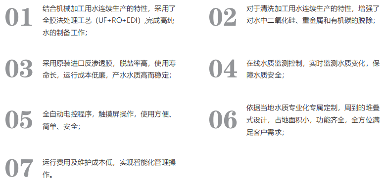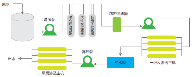 該設(shè)備在預(yù)處理階段采用多介質(zhì)過濾器、活性炭過濾器、鈉離子軟化床去除泥沙、余氯、懸浮物、部分重金屬離子,通過精密過濾器攔截水體中膠體、小顆粒,經(jīng)過反滲透膜(RO膜)去除水體中絕大部分離子,脫鹽率可以達(dá)到98.5%以上,二級(jí)反滲透膜再次脫鹽,超純水電導(dǎo)率可以達(dá)到在5μS/cm以下。
